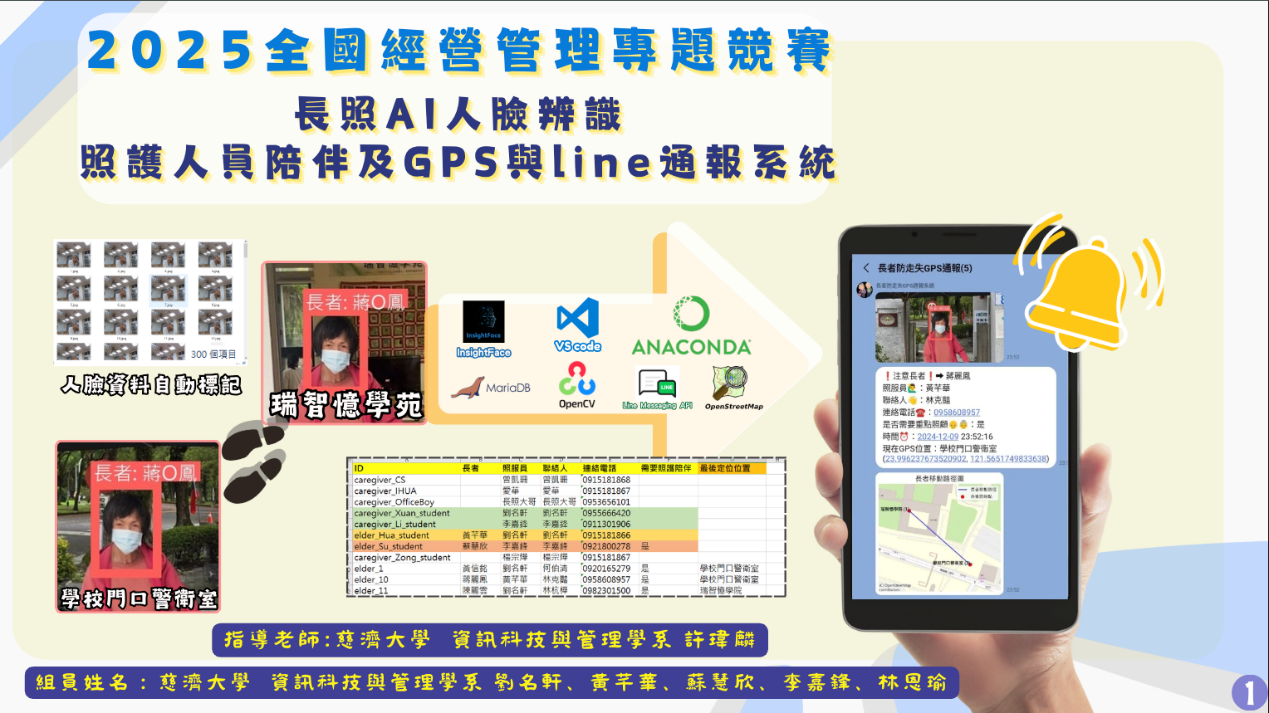 長照AI人臉辨識-照護陪伴及通報系統:榮獲 2025全國經營管理專題競賽 第三名/2024太平洋盃科技教育競賽軟體創客組銀牌/2024全國經營管理專題競賽資訊組第二名